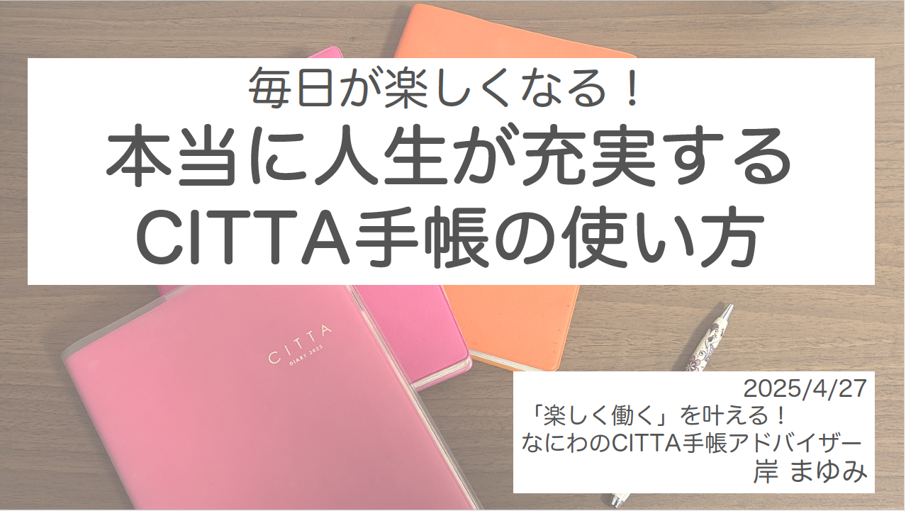 ※2種類のチケットからお選びください。 ①CITTA手帳付き:8,500円 ・2025年10月始まりのCITTA手帳(税込 4,070円)が付きます! ※1,070円割引(3,000円でCITTA手帳の購入が可能!) ・お申し込み時、お好きな色味をお選びいただけます。 ②手帳なし:5,500円 ※講座後、割引価格(3,000円)にてCITTA手帳の購入可 |
